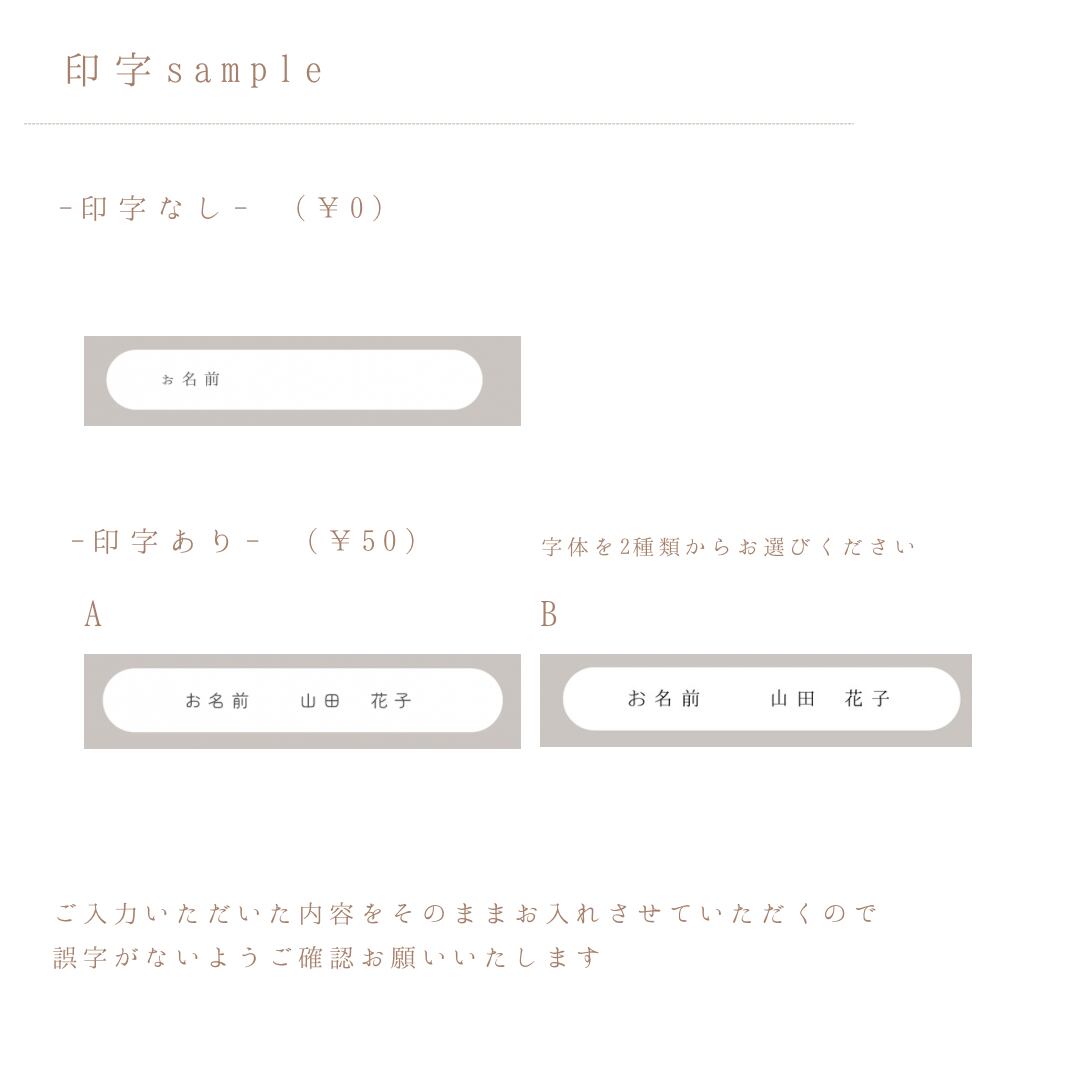 ⑤ 白枠内のお名前情報印字(+¥50)を希望される場合、以下も備考欄へご記入ください